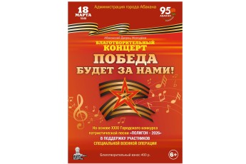 В Абакане (Хакасия) 18 марта состоится благотворительный концерт "Победа будет за нами!", посвященный поддержке российских военнослужащих, у...